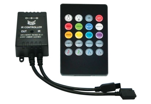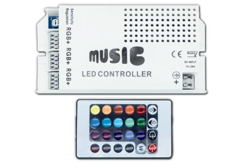 Τάση εισόδου: 12-24V DCΡεύμα εξόδου: 3x3 A max/κανάλιΙσχύς: 108W max (12V), 216W max (24V)Κατάλληλο για: Tη ρύθμιση φωτεινότητας και αλλαγής χρωμάτων ταινιών LED RGB ανάλογα με το ρυθμό της μουσικής, με ασύρματο χειριστήριο IR. Ιδανικό για πάρτυ.Η συσκευασία περιλαμβάνει: 1 IR music sound Led controller dimmer, 1 ασύρματο χειριστήριο IR με εμβέλεια από 5 έως 10m σε ανοικτό χώρο με 24 κουμπιά χειρισμού: 16 static colors, 2 dynamic modes: flash and fade, 2 sound changing mode, adjustable sound receiving sensitivity. Διαστάσεις 155x78x30 mmΒάρος: 0,130 Kgr