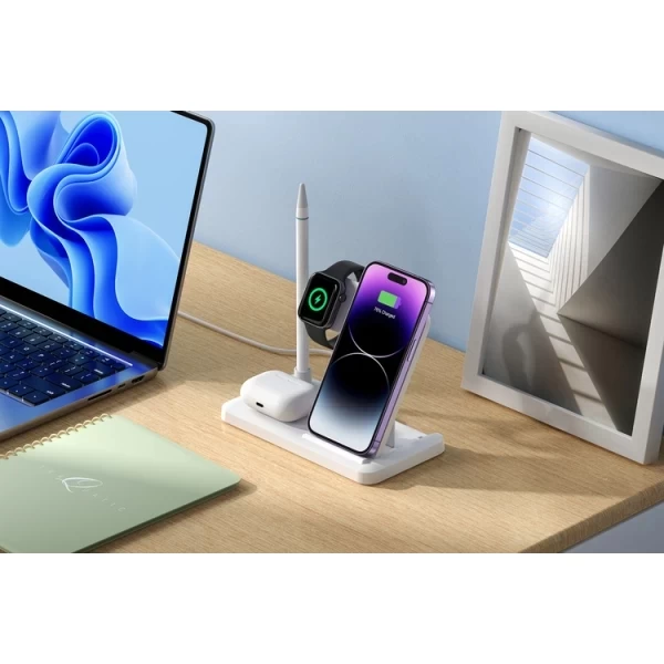 Wireless inductive 4-in-1 charger, designed to charge smartphones, Apple watches, AirPods, and the Apple Pencil.